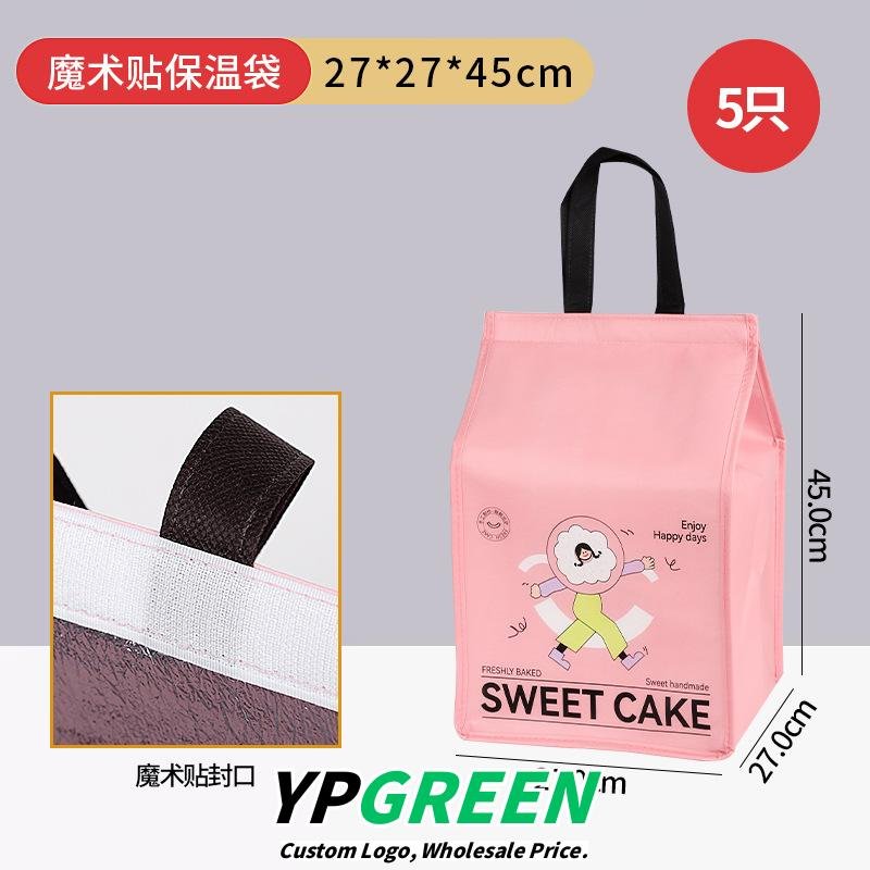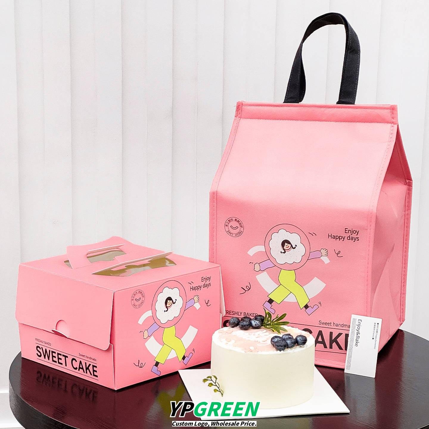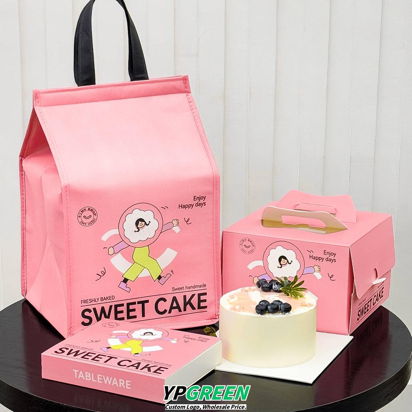 These pink disposable insulated bags are made for 4-6 inch cakes, desserts, and bakery takeout. They use non-woven fabric with aluminum foil lining to keep items warm or cold during delivery. The outer pink color looks soft and appealing for sweet treats.