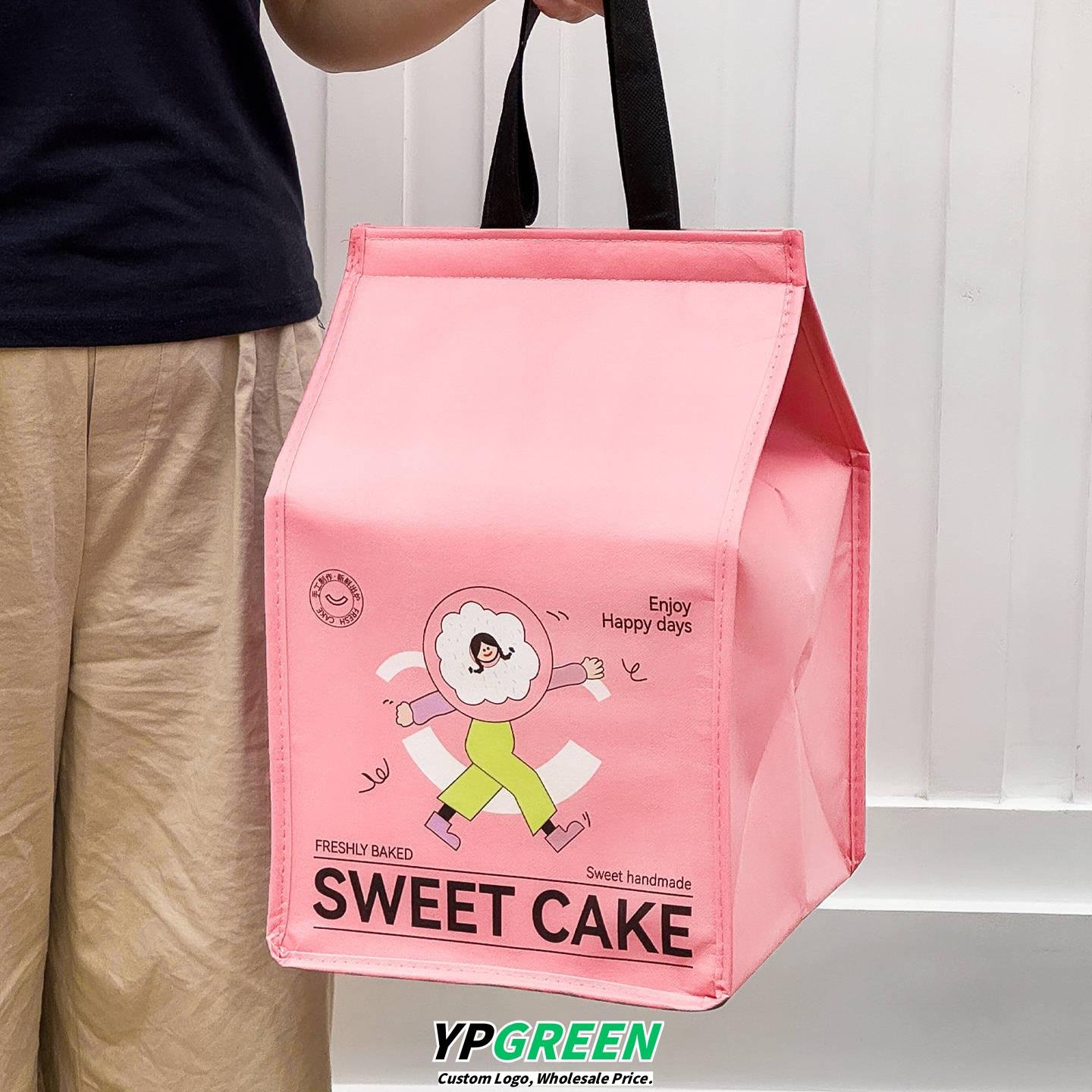 We print your logo on the insulated bags to match your bakery's pink theme. The ink is safe and stays clear on the non-woven fabric.